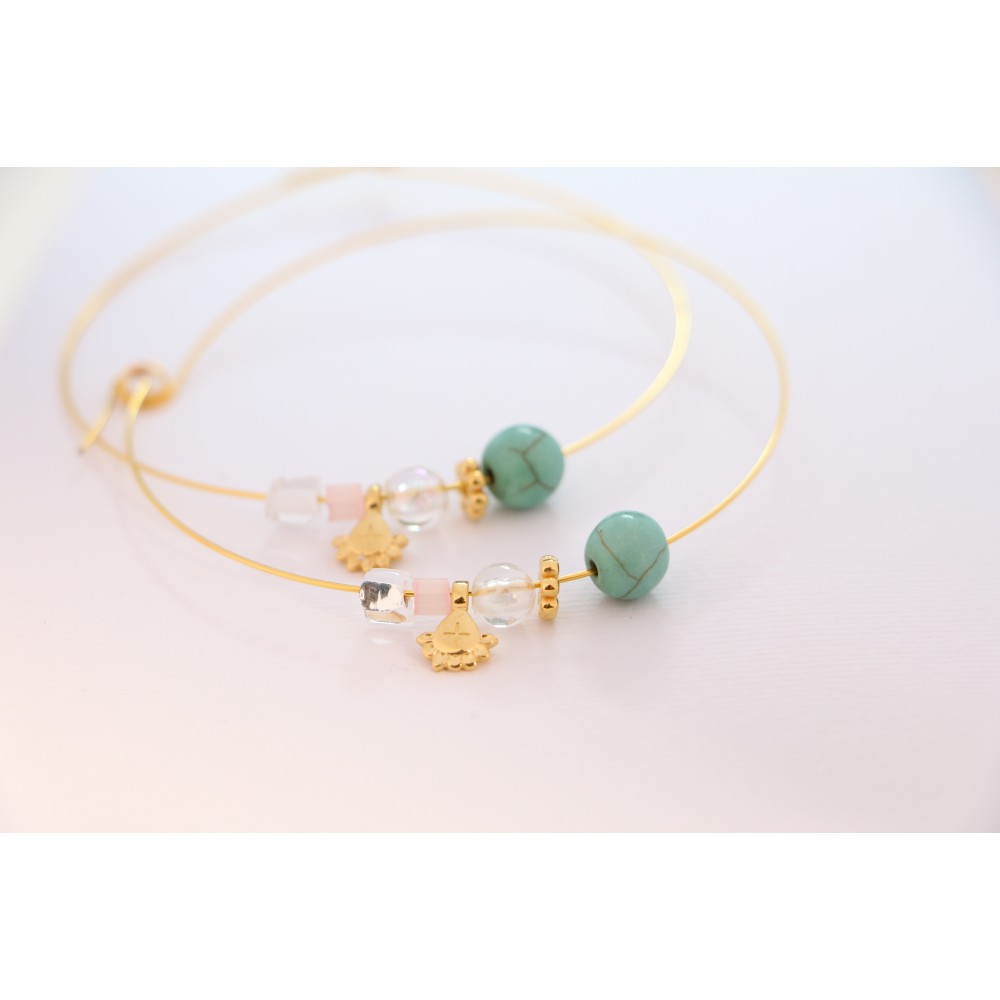 Χειροποίητο μαρτυρικό βάπτισης για κορίτσι Celfie & Co, βραχιόλι με σταυρό σε σχήμα λούλουδι επιχρυσωμένο με 24Κ, χρυσή χειροπέδα, χαολίτη χρώματος τιρκουάζ, στρογγυλές και πλακέ χάντρες σε διάφανους χρωματισμούς καθώς και χρυσή λεπτομέρεια σε σχήμα λουλούδι.